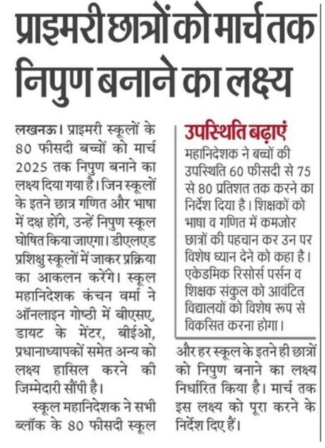 ⏩📌 *प्राइमरी छात्रों को मार्च तक निपुण बनाने का लक्ष्य घोषित महानिदेशक कंचन वर्मा ने दिए निर्देश* !!