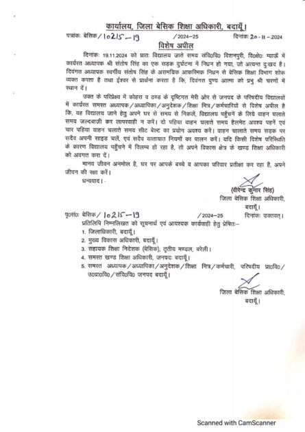 рдЙрдХреНрддреНрдд рдХреЗ рдкрд░рд┐рдкреНрд░реЗрдХреНрд╖реНрдп рдореЗрдВ рдХреЛрд╣рд░рд╛ рд╡ рдардгреНрдб рдХреЗ рджреГрд╖реНрдЯрд┐рдЧрдд рдореЗрд░реА рдУрд░ рд╕реЗ рдЬрдирдкрдж рдХреЗ рдкрд░рд┐рд╖рджреАрдп рд╡рд┐рджреНрдпрд╛рд▓рдпреЛрдВ рдореЗрдВ рдХрд╛рд░реНрдпрд░рдд рд╕рдорд╕реНрдд рдЕрдзреНрдпрд╛рдкрдХ/рдЕрдзреНрдпрд╛рдкрд┐рдХрд╛/рдЕрдиреБрджреЗрд╢рдХ / рд╢рд┐рдХреНрд╖рд╛ рдорд┐рддреНрд░/рдХрд░реНрдордЪрд╛рд░рд┐рдпреЛрдВ рд╕реЗ рд╡рд┐рд╢реЗрд╖ рдЕрдкреАрд▓ рд╣реИ рдХрд┐, рд╡рд╣ рд╡рд┐рджреНрдпрд╛рд▓рдп рдЬрд╛рдиреЗ рд╣реЗрддреБ рдЕрдкрдиреЗ рдШрд░ рд╕реЗ рд╕рдордп рд╕реЗ рдирд┐рдХрд▓реЗрдВ, рд╡рд┐рджреНрдпрд╛рд▓рдп рдкрд╣реБрдБрдЪрдиреЗрдВ рдХреЗ рд▓рд┐рдпреЗ рд╡рд╛рд╣рди рдЪрд▓рд╛рддреЗ рд╕рдордп рдЬрд▓реНрджрдмрд╛рдЬрд╝реА рдХрд░ рд▓рд╛рдкрд░рд╡рд╛рд╣реА рди рдХрд░реЗрдВред рджреЛ рдкрд╣рд┐рдпрд╛ рд╡рд╛рд╣рди рдЪрд▓рд╛рддреЗ рд╕рдордп рд╣реИрд▓рдореЗрдЯ рдЕрд╡рд╢реНрдп рдкрд╣рдиреЗрдВ рдПрд╡рдВ рдЪрд╛рд░ рдкрд╣рд┐рдпрд╛ рд╡рд╛рд╣рди рдЪрд▓рд╛рддреЗ рд╕рдордп рд╕реАрдЯ рдмреЗрд▓реНрдЯ рдХрд╛ рдкреНрд░рдпреЛрдЧ рдЕрд╡рд╢реНрдп рдХрд░реЗрдВред рд╡рд╛рд╣рди рдЪрд╛рд▓рд╛рддреЗ рд╕рдордп рд╕рдбрд╝рдХ рдкрд░ рд╕рджреИрд╡ рдЕрдкрдиреА рд╕рд╛рдЗрдб рдЪрд▓реЗрдВ, рдПрд╡рдВ рд╕рджреИрд╡ рдпрд╛рддрд╛рдпрд╛рдд рдирд┐рдпрдореЛрдВ рдХрд╛ рдкрд╛рд▓рди рдХрд░реЗрдВред рдпрджрд┐ рдХрд┐рд╕реА рд╡рд┐рд╢реЗрд╖ рдкрд░рд┐рд╕реНрдерд┐рддрд┐ рдХреЗ рдХрд╛рд░рдг рд╡рд┐рджреНрдпрд╛рд▓рдп рдкрд╣реБрдБрдЪрдиреЗ рдореЗрдВ рд╡рд┐рд▓рдореНрдм рд╣реЛ рд░рд╣рд╛ рд╣реИ, рддреЛ рдЕрдкрдиреЗ рд╡рд┐рдХрд╛рд╕ рдХреНрд╖реЗрддреНрд░ рдХреЗ рдЦрдгреНрдб рд╢рд┐рдХреНрд╖рд╛ рдЕрдзрд┐рдХрд╛рд░реА рдХреЛ рдЕрд╡рдЧрдд рдХрд░рд╛ рджреЗрдВред
