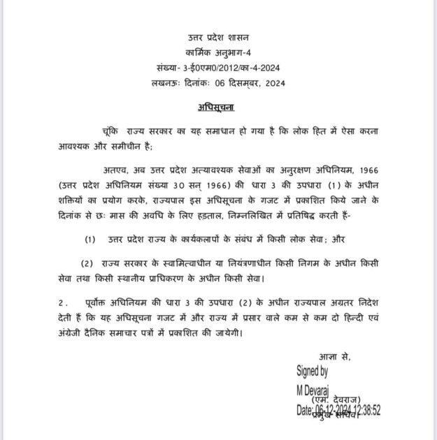 यूपी में सरकारी कर्मचारी व सरकारी सेवाओं से जुड़े कर्मचारी अगले छह महीनों तक हड़ताल नहीं कर सकेंगे। इस संबंध में आदेश जारी कर दिया गया है।