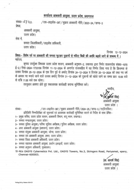 24,25 और 31 दिसम्बर को रात 10 बजे के बजाय 11 बजे तक खुलेंगी शराब की दुकान!!