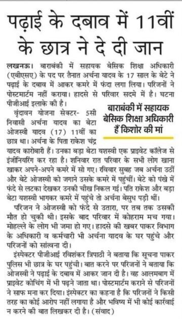 पढ़ाई के बढ़ते दबाव के चलते लखनऊ के पीजीआई इलाके में एक 17 वर्षीय छात्र ने अपनी जान दे दी। **ओजस्वी यादव**, जो बाराबंकी में सहायक बेसिक शिक्षा अधिकारी अर्चना यादव के बेटे थे, ने रविवार सुबह अपने कमरे में फांसी लगाकर आत्महत्या कर ली। इस घटना से परिवार और मोहल्ले में शोक की लहर दौड़ गई।