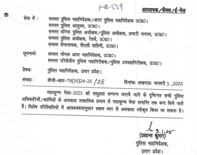 рдорд╣рд╛рдХреБрдВрдн рдореЗрд▓рд╛ 2025 рдХреЛ рд▓реЗрдХрд░ рдпреВрдкреА рдХреЗ рд╕рднреА рдкреБрд▓рд┐рд╕ рдЕрдзрд┐рдХрд╛рд░рд┐рдпреЛрдВ рд╡ рдХрд░реНрдордЪрд╛рд░рд┐рдпреЛрдВ рдХреА рдЫреБрдЯреНрдЯрд┐рдпрд╛рдВ рдореЗрд▓рд╛ рд╕рдорд╛рдкреНрддрд┐ рддрдХ рд╕реНрдердЧрд┐рддред