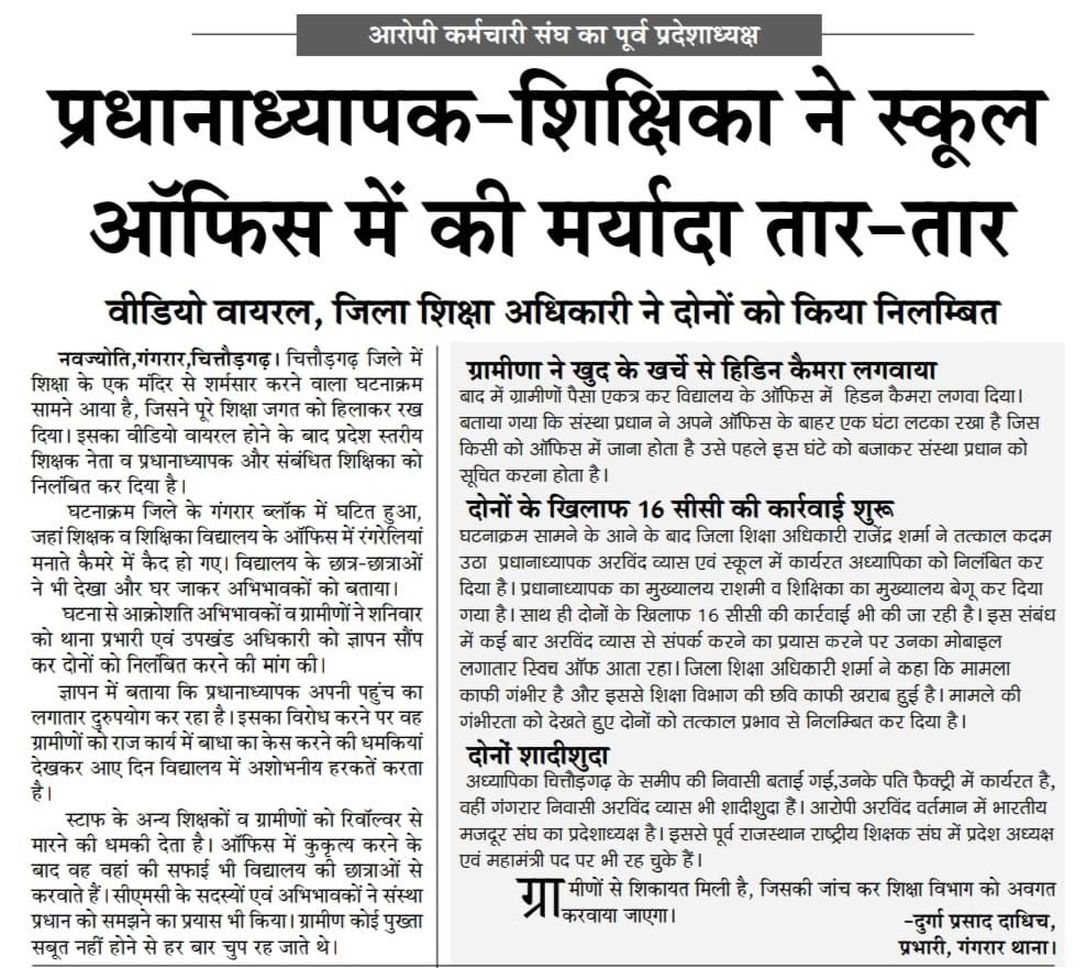 नवज्योति, गंगरार, चित्तौड़गढ़। चित्तौड़गढ़ जिले में शिक्षा के एक मंदिर से शर्मसार करने वाला मामला सामने आया है, जिसने पूरे शिक्षा जगत को हिला दिया। एक वीडियो वायरल होने के बाद जिला शिक्षा अधिकारी ने प्रधानाध्यापक और संबंधित शिक्षिका को तत्काल प्रभाव से निलंबित कर दिया।
