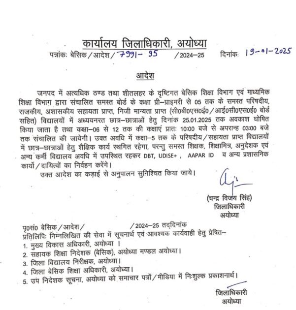 जनपद में अत्यधिक ठण्ड तथा शीतलहर के दृष्टिगत बेसिक शिक्षा विभाग एवं माध्यमिक शिक्षा विभाग द्वारा संचालित समस्त बोर्ड के कक्षा प्री-प्राइमरी से 05 तक के समस्त परिषदीय, राजकीय, अशासकीय सहायता प्राप्त, निजी मान्यता प्राप्त (सी०बी०एस०ई०/ आई०सी०एस०ई० बोर्ड सहित) विद्यालयों में अध्ययनरत छात्र-छात्राओं हेतु दिनांक 25.01.2025 तक अवकाश घोषित किया जाता है तथा कक्षा-06 से 12 तक की कक्षाएं प्रातः 10:00 बजे से अपरान्ह 03:00 बजे तक संचालित की जायेगी। उक्त अवधि में कक्षा 5 तक के परिषदीय / सहायता प्राप्त विद्यालयों में छात्र-छात्राओं हेतु शैक्षिक कार्य स्थगित रहेगा, परन्तु समस्त शिक्षक, शिक्षामित्र, अनुदेशक एवं अन्य कर्मी विद्यालय अवधि में उपस्थित रहकर DBT, UDISE+ AAPAR ID व अन्य प्रशासनिक