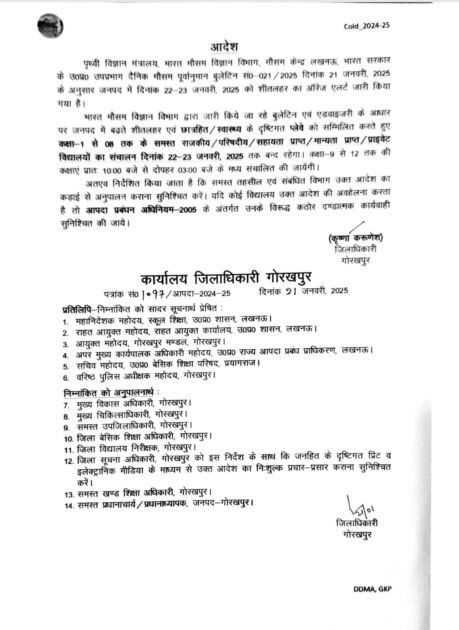 भारत मौसम विज्ञान विभाग द्वारा जारी किये जा रहे बुलेटिन एवं एडवाइजरी के आधार पर जनपद में बढ़ते शीतलहर एवं छात्रहित / स्वास्थ्य के दृष्टिगत प्लेवे को सम्मिलित करते हुए कक्षा-1 से 08 तक के समस्त राजकीय / परिषदीय/सहायता प्राप्त/मान्यता प्राप्त/प्राइवेट विद्यालयों का संचालन दिनांक 22-23 जनवरी, 2025 तक बन्द रहेगा। कक्षा-9 से 12 तक की कक्षाएं प्रातः 10:00 बजे से दोपहर 03:00 बजे के मध्य संचालित की जायेंगी।