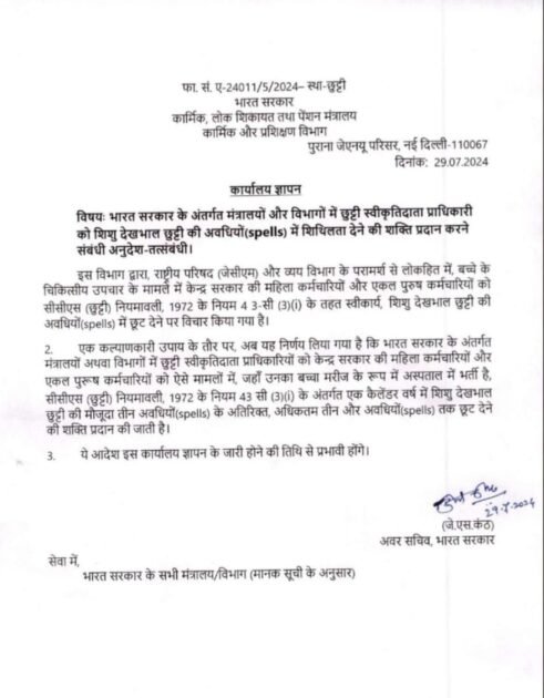 विषयः भारत सरकार के अंतर्गत मंत्रालयों और विभागों में छुट्टी स्वीकृतिदाता प्राधिकारी को शिशु देखभाल छुट्टी की अवधियों (spells) में शिथिलता देने की शक्ति प्रदान करने संबंधी अनुदेश-तत्संबंधी।