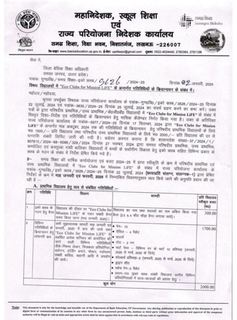 कृपया संलग्न पत्र का संज्ञान लेने का कष्ट करें, जो कि समग्र शिक्षा के अंतर्गत ECO Clubs for Mission LiFE के लिए प्राथमिक एवम् उच्च प्राथमिक विद्यालयों में माह जनवरी एवं फरवरी,2025 तक गतिविधियों के क्रियान्वयन हेतु लिमिट जारी किए जाने के संबंध में है।