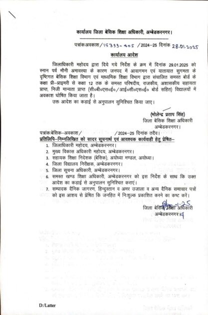 जिलाधिकारी महोदय द्वारा दिये गये निर्देश के क्रम में दिनांक 29.01.2025 को स्नान पर्व मौनी अमावस्या के कारण जनपद में आवागमन एवं यातायात सुगमता के दृष्टिगत बेसिक शिक्षा विभाग एवं माध्यमिक शिक्षा विभाग द्वारा संचालित समस्त बोर्ड के कक्षा प्री-प्राइमरी से कक्षा 12 तक के समस्त परिषदीय, राजकीय, अशासकीय सहायता प्राप्त, निजी मान्यता प्राप्त (सी०बी०एस०ई०/आई०सी०एस०ई० बोर्ड सहित) विद्यालयों में अवकाश घोषित किया जाता है।