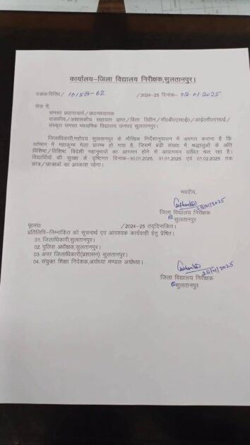 जिलाधिकारी, महोदय सुलतानपुर के मौखिक निर्देशानुपालन में अवगत कराना है कि वर्तमान में महाकुम्भ मेला प्रारम्भ हो गया है, जिसमें बड़ी संख्या में श्रद्धालुओं के अति विशिष्ट/विशिष्ट विदेशी महानुभावों का आगमन होने से आवागमन याधित चल रहा है। विद्यार्थियों की सुरक्षा के दृष्टिगत दिनांक 30.01.2025, 31.01.2025 एवं 01.02.2025 तक छात्र/छात्राओं का अवकाश रहेगा।