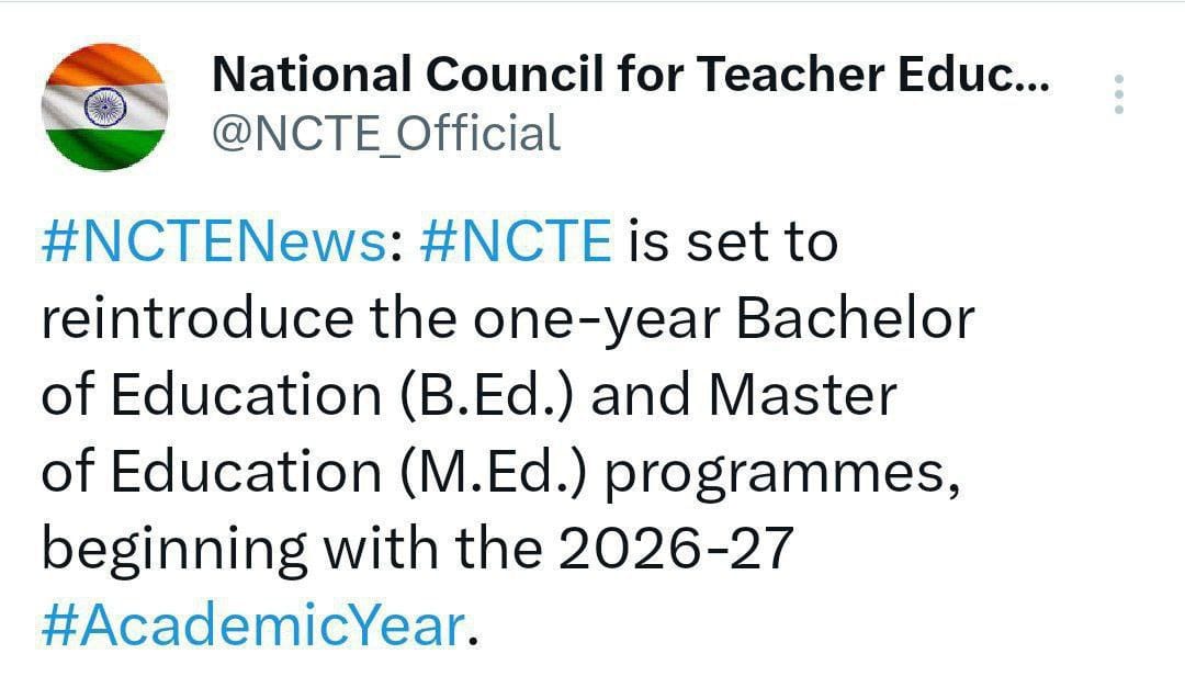 💫 राष्ट्रीय अध्यापक शिक्षा परिषद (NCTE) ने घोषणा की है कि वह 2026-27 शैक्षणिक सत्र से एक वर्षीय बी.एड. (B.Ed.) और एम.एड. (M.Ed.) कार्यक्रमों को फिर से शुरू करने जा रही है।