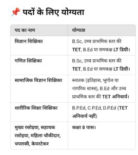 पद का नामयोग्यताविज्ञान शिक्षिका B.Sc, उच्च प्राथमिक स्तर की TET, B.Ed या समकक्ष LT डिग्री।गणित शिक्षिका B.Sc, उच्च प्राथमिक स्तर की TET, B.Ed या समकक्ष LT डिग्री।सामाजिक विज्ञान शिक्षिका स्नातक (इतिहास, भूगोल या नागरिक शास्त्र), B.Ed और उच्च प्राथमिक स्तर की TET अनिवार्य।शारीरिक शिक्षा शिक्षिका B.P.Ed, C.P.Ed, D.P.Ed (TET अनिवार्य नहीं) मुख्य रसोइया, सहायक रसोइया, महिला चौकीदार, चपरासी, केयरटेकरकक्षा 8 पास।