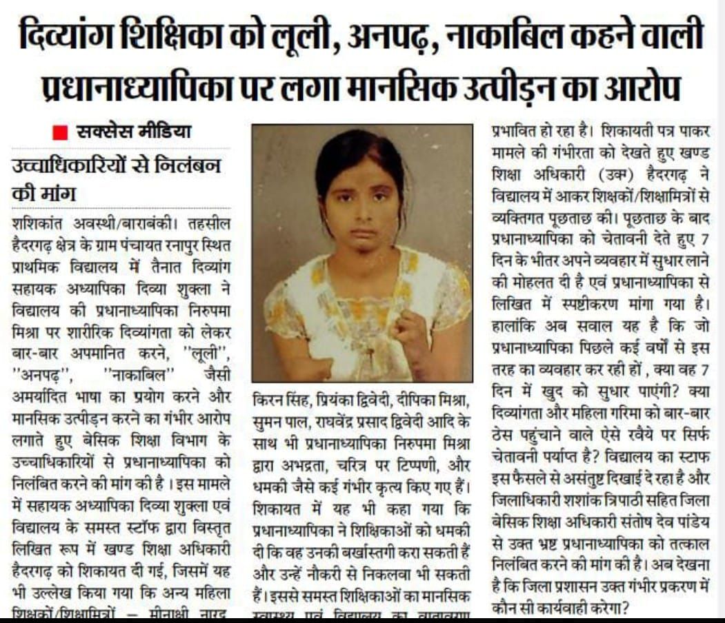बाराबंकी के तहसील हैदरगढ़ क्षेत्र के ग्राम पंचायत रनापुर स्थित प्राथमिक विद्यालय में तैनात दिव्यांग सहायक अध्यापिका दिव्या शुक्ला ने विद्यालय की प्रधानाध्यापिका निरुपमा मिश्रा पर शारीरिक दिव्यांगता को लेकर बार-बार अपमानित करने का गंभीर आरोप लगाया है।