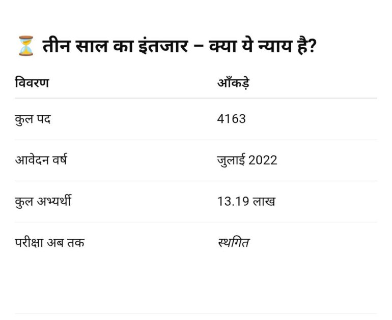 4163 рдкрджреЛрдВ рдкрд░ рднрд░реНрддреА рдХреЗ рд▓рд┐рдП рдЬреБрд▓рд╛рдИ 2022 рдореЗрдВ рдЖрд╡реЗрджрди рд╣реБрдЖ рдерд╛ред 13.19 рд▓рд╛рдЦ рд╕реЗ рдЕрдзрд┐рдХ рдЕрднреНрдпрд░реНрдереА рдЕрдм рддрдХ рддреАрди рд╕рд╛рд▓ рд╕реЗ рдкрд░реАрдХреНрд╖рд╛ рдХреА рд░рд╛рд╣ рддрд╛рдХ рд░рд╣реЗ рд╣реИрдВред