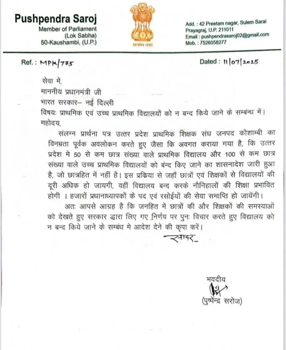 माननीय प्रधानमंत्री जी को संबोधित एक पत्र में, श्री पुष्पेन्द्र सरोज, लोकसभा सांसद (कौशाम्बी), ने उत्तर प्रदेश सरकार द्वारा जारी किए गए आदेश के खिलाफ आवाज उठाई है जिसमें 50 से कम छात्र संख्या वाले प्राथमिक विद्यालयों और 100 से कम छात्र संख्या वाले उच्च प्राथमिक विद्यालयों को बंद करने का निर्णय लिया गया है।