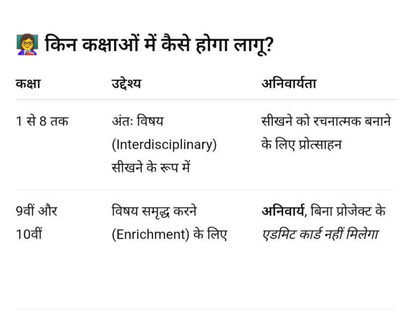 рдЕрдм рд╕рд┐рд░реНрдл рдкрд╛рдареНрдпрдкреБрд╕реНрддрдХреЛрдВ рдХреЛ рд░рдЯрдирд╛ рдХрд╛рдлреА рдирд╣реАрдВ рд╣реЛрдЧрд╛ тАФ рдЫрд╛рддреНрд░реЛрдВ рдХреЛ рднрд╛рд░рддреАрдп рдХрд▓рд╛ рдХреЗ рдХрд┐рд╕реА рдПрдХ рд░реВрдк (рдЬреИрд╕реЗ тАУ рд╕рдВрдЧреАрдд, рдиреГрддреНрдп, рдЪрд┐рддреНрд░рдХрд▓рд╛, рдирд╛рдЯрдХ рдЖрджрд┐) рд╕реЗ рдЬреБрдбрд╝рддреЗ рд╣реБрдП рдПрдХ рдкреНрд░реЛрдЬреЗрдХреНрдЯ рддреИрдпрд╛рд░ рдХрд░рдирд╛ рд╣реЛрдЧрд╛ред