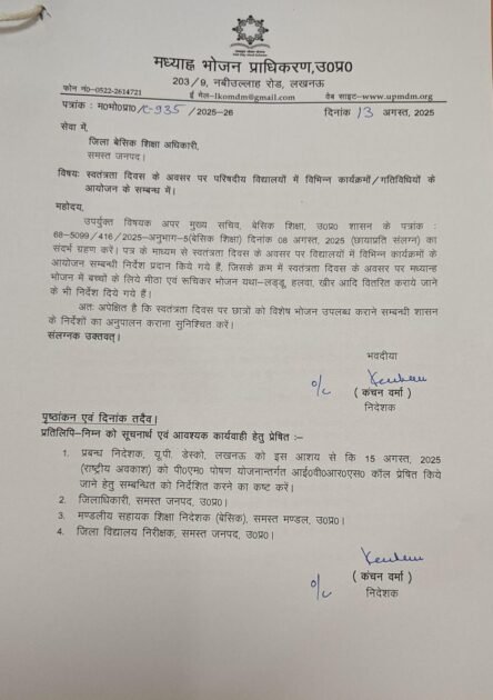 बेसिक शिक्षा विभाग ने यह भी स्पष्ट किया है कि सभी विद्यालय शासन द्वारा जारी निर्देशों का शत-प्रतिशत पालन करें और यह सुनिश्चित करें कि सभी बच्चों को विशेष भोजन समय से मिले।