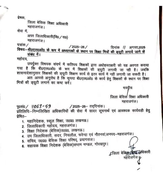 рдЬрд┐рд▓рд╛ рдмреЗрд╕рд┐рдХ рд╢рд┐рдХреНрд╖рд╛ рдЕрдзрд┐рдХрд╛рд░реА, рдорд╣рд╛рд░рд╛рдЬрдЧрдВрдЬ рдХрд╛ рдпрд╣ рд╕реНрдкрд╖реНрдЯ рдирд┐рд░реНрджреЗрд╢ рд╣реИ рдХрд┐ рд╢рд┐рдХреНрд╖рдХреЛрдВ рдХреА рдЬрдЧрд╣ рд╢рд┐рдХреНрд╖рд╛-рдорд┐рддреНрд░реЛрдВ рдХреЛ рдмреАрдПрд▓рдУ/рдХреНрд╖реЗрддреНрд░реАрдп рдбреНрдпреВрдЯреА рдкрд░ рд▓рдЧрд╛рдпрд╛ рдЬрд╛рдПред рд╕рднреА рдЕрдзрд┐рдХрд╛рд░реАрдЧрдг рдЕрдиреБрдкрд╛рд▓рди рд╕реБрдирд┐рд╢реНрдЪрд┐рдд рдХрд░реЗрдВ рдФрд░ рдкрд╛рд▓рди рдХреА рд╕реНрдерд┐рддрд┐ рдХреА рд░рд┐рдкреЛрд░реНрдЯ рд╕рдордпрд╛рдиреБрд╕рд╛рд░ рднреЗрдЬреЗрдВред