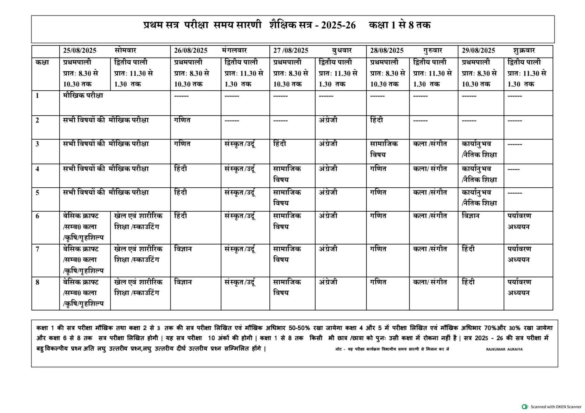 मौखिक परीक्षा (सभी विषय) पूरे सप्ताह कक्षा-शिक्षक द्वारा खेल-आधारित गतिविधियों के माध्यम से।