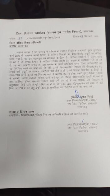लखनऊ जनपद में पंचायत निर्वाचक नामावली वृहद पुनरीक्षण कार्य 2025 के तहत शिक्षकों को बी.एल.ओ. (BLO) ड्यूटी सौंपी गई है। यह कार्य बेहद महत्वपूर्ण और समयबद्ध है, लेकिन प्रशासन को लगातार शिकायतें मिल रही हैं कि कुछ शिक्षक ड्यूटी के दौरान स्कूलों में उपस्थित नहीं हो रहे हैं।
