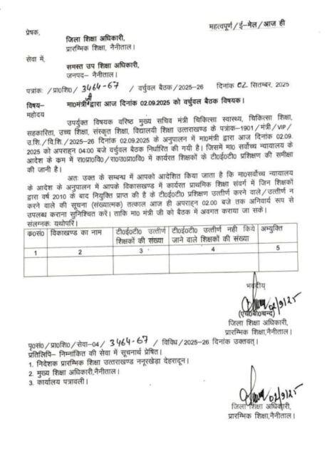 उत्तराखण्ड के प्राथमिक शिक्षा विभाग में हलचल मच गई है। जिला शिक्षा अधिकारी (प्रा० शिक्षा) नैनीताल द्वारा आज 02 सितम्बर 2025 को एक अहम वर्चुअल बैठक बुलाई गई है। यह बैठक मा० मंत्री जी की अध्यक्षता में अपराह्न 04:00 बजे आयोजित की जाएगी।