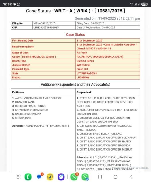 आप सभी को अवगत कराना है कि उ प्र बेसिक शिक्षा परिषद में पदोन्नति प्राप्त शिक्षकों को अपने मूल पद पर बैक किए जाने हेतु उक्त याचिका माननीय उच्च न्यायालय लखनऊ में योजित की गई है कृपया सतर्क रहें और  संगठित रहे