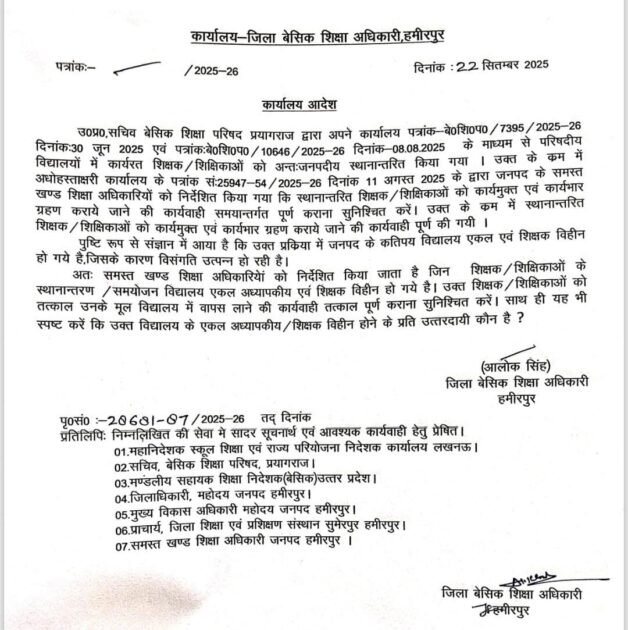 हमीरपुर में भी समायोजन मे जो विद्यालय एकल हो गए थे उनके अध्यापको की तत्काल पूर्व विद्यालय मे वापसी….
