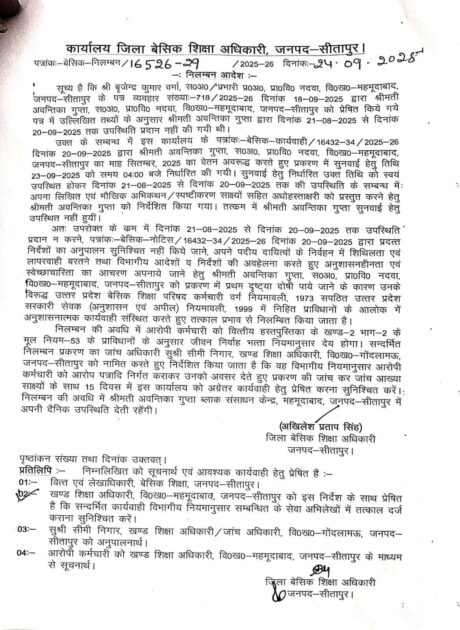 जनपद-सीतापुर के महमूदाबाद विकास खंड के प्राथमिक विद्यालय नदवा में तैनात सहायक अध्यापिका श्रीमती अवन्तिका गुप्ता को जिला बेसिक शिक्षा अधिकारी द्वारा निलंबित कर दिया गया है।