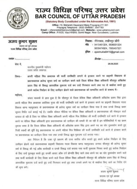 अपनी महिला मित्र अध्यापक की फर्जी उपस्थिति लगाने से इनकार करने पर प्राइमरी विद्यालय के प्रधानाध्यापक ब्रजेन्द्र कुमार वर्मा का उत्पीड़न करने वाले जिला बेसिक शिक्षा अधिकारी सीतापुर अखिलेश प्रताप सिंह के विरूद्ध आपराधिक मुकदमा दर्ज कर उन्हें गिरफ्तार करने तथा पद से बर्खास्त करते हुए अपने कर्तव्य निर्वाहन के लिए उत्पीड़न झेलने वाले प्रधानाध्यपक को सम्मानित करने के सम्बन्ध में-