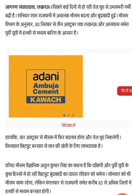 рдЙрддреНрддрд░ рдкреНрд░рджреЗрд╢ рдореЗрдВ рдореМрд╕рдо рдПрдХ рдмрд╛рд░ рдлрд┐рд░ рдХрд░рд╡рдЯ рд▓реЗрдиреЗ рд╡рд╛рд▓рд╛ рд╣реИред ЁЯМжя╕П рд▓рдЦрдирдК рд╕рд╣рд┐рдд 35 рд╕реЗ рдЕрдзрд┐рдХ рдЬрд┐рд▓реЛрдВ рдореЗрдВ рдмрд╛рд░рд┐рд╢ рдХрд╛ рдЕрд▓рд░реНрдЯ рдЬрд╛рд░реА рдХрд┐рдпрд╛ рдЧрдпрд╛ рд╣реИред рд▓рдЧрд╛рддрд╛рд░ рдмрдврд╝ рд░рд╣реА рдЙрдорд╕ рдФрд░ рдЧрд░реНрдореА рд╕реЗ рд▓реЛрдЧреЛрдВ рдХреЛ рд░рд╛рд╣рдд рдорд┐рд▓рдиреЗ рдХреА рдЙрдореНрдореАрдж рд╣реИред