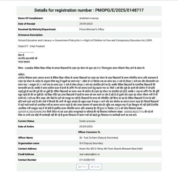 Time and motion :आज माननीय प्रधानमंत्री कार्यालय में शिकायत कर उत्तरप्रदेश में संचालित बेसिक शिक्षा परिषद के विद्यालय का टाइम एंड मोशन के तहत समय को परिवर्तित करने के संबध में कार्यवाही की गई