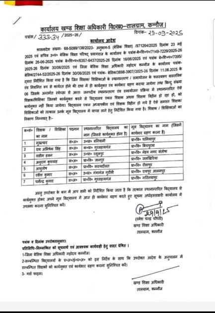 कन्नौज में भी समायोजन रद्द,एकल विद्यालय में होगी वापसी