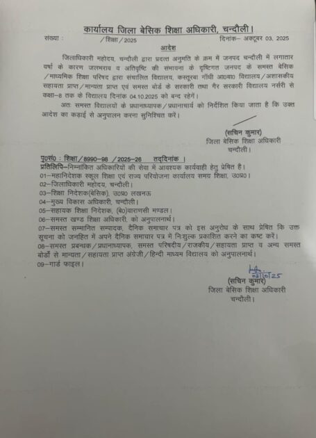 भारी वर्षा के दृष्टिगत जिलाधिकारी महोदय के निर्देशानुसार कल दिनांक 04.10.2025 को कक्षा 1-8 तक के संचालित समस्त विद्यालय बन्द रहेंगे।सभी शिक्षक “समर्थ भारत समर्थ उत्तर प्रदेश”, “Viksit Bharat Buildathon 2025” “स्वच्छ एवं हरित विद्यालय”, डीबीटी, तथा Udise, का कार्य यथावत करते रहेंगे – आज्ञा से बीएसए सोनभद्र