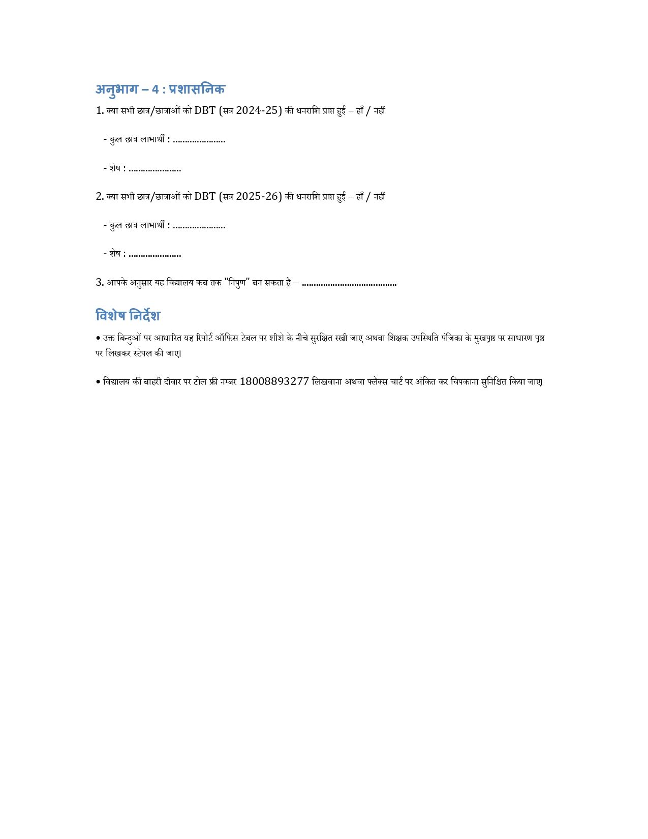 • विद्यालय की बाहरी दीवार पर टोल फ्री नम्बर 18008893277 लिखवाना अथवा फ्लैक्स चार्ट पर अंकित कर चिपकाना सुनिश्चित किया जाए।