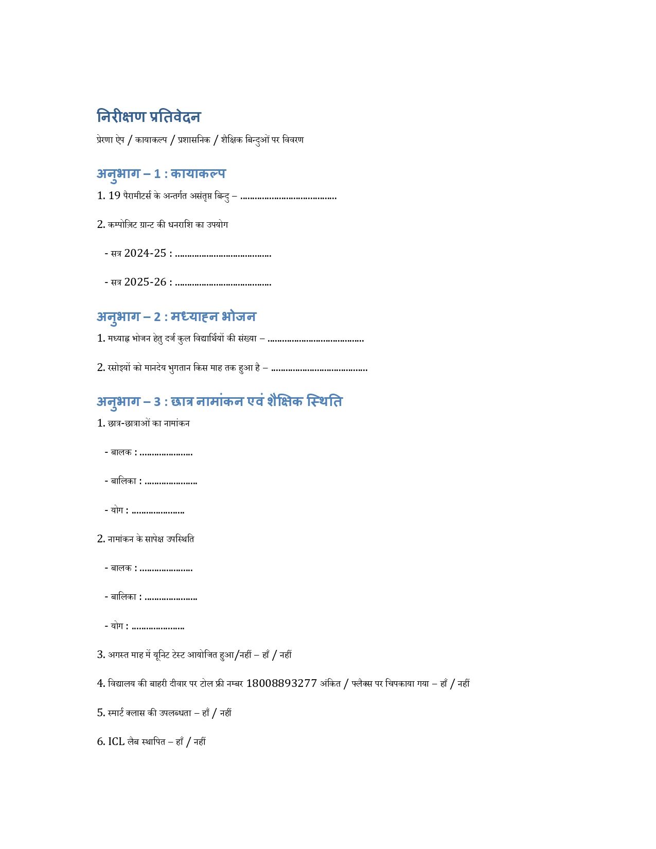 फॉर्मेट : BEO के द्वारा भरा जाने वाला विद्यालय निरीक्षण रिपोर्ट 2025 – प्रेरणा ऐप एवं कायाकल्प विवरण