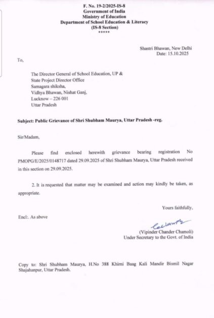 рдпрд╣ рдкрддреНрд░ рд╢рд╛рд╕реНрддреНрд░реА рднрд╡рди, рдирдИ рджрд┐рд▓реНрд▓реА рд╕реЗ рджрд┐рдирд╛рдВрдХ 15 рдЕрдХреНрдЯреВрдмрд░ 2025 рдХреЛ рдЬрд╛рд░реА рдХрд┐рдпрд╛ рдЧрдпрд╛, рдЬрд┐рд╕реЗ рдЙрддреНрддрд░ рдкреНрд░рджреЗрд╢ рдХреЗ рдирд┐рджреЗрд╢рдХ рд╕рд╛рдорд╛рдиреНрдп рд╡рд┐рджреНрдпрд╛рд▓рдп рд╢рд┐рдХреНрд╖рд╛ рдПрд╡рдВ рд░рд╛рдЬреНрдп рдкрд░рд┐рдпреЛрдЬрдирд╛ рдирд┐рджреЗрд╢рдХ, рд╕рдордЧреНрд░ рд╢рд┐рдХреНрд╖рд╛, рд╡рд┐рджреНрдпрд╛ рднрд╡рди, рд▓рдЦрдирдК рдХреЛ рднреЗрдЬрд╛ рдЧрдпрд╛ рд╣реИред