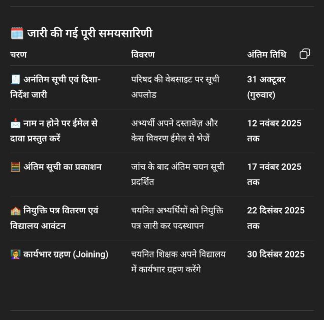 тАЬрд╕реБрдкреНрд░реАрдо рдХреЛрд░реНрдЯ рдХреЗ рдЖрджреЗрд╢ рдХрд╛ рдкреВрд░реНрдг рдкрд╛рд▓рди рдХрд░рддреЗ рд╣реБрдП рд╕рднреА рдпрд╛рдЪреА рдЕрднреНрдпрд░реНрдерд┐рдпреЛрдВ рдХреЛ рдЕрд╡рд╕рд░ рджрд┐рдпрд╛ рдЬрд╛ рд░рд╣рд╛ рд╣реИред рдЬреЛ рдЕрднреНрдпрд░реНрдереА рдкрд╛рддреНрд░ рдкрд╛рдП рдЬрд╛рдПрдВрдЧреЗ, рдЙрдиреНрд╣реЗрдВ 22 рджрд┐рд╕рдВрдмрд░ рддрдХ рдирд┐рдпреБрдХреНрддрд┐ рдкрддреНрд░ рдЬрд╛рд░реА рдХрд░ рджрд┐рдпрд╛ рдЬрд╛рдПрдЧрд╛, рдФрд░ 30 рджрд┐рд╕рдВрдмрд░ рдХреЛ рд╡реЗ рд╡рд┐рджреНрдпрд╛рд▓рдпреЛрдВ рдореЗрдВ рдХрд╛рд░реНрдпрднрд╛рд░ рдЧреНрд░рд╣рдг рдХрд░реЗрдВрдЧреЗредтАЭ