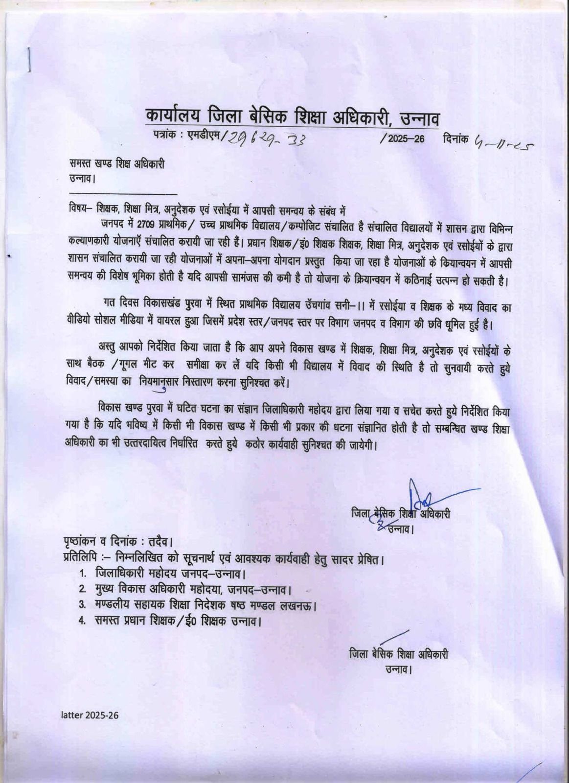 जिला बेसिक शिक्षा अधिकारी, उन्नाव द्वारा सभी ब्लॉक शिक्षा अधिकारी (BEO) एवं संबंधित शिक्षण स्टाफ को यह निर्देश प्रेषित किया गया है ताकि