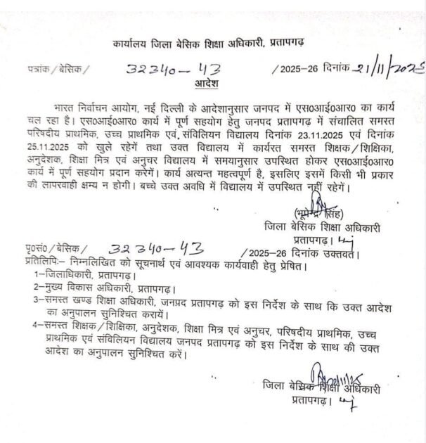 *प्रतापगढ़:* *एस.आई.आर. कार्य में पूर्ण सहयोग हेतु* जनपद के समस्त परिषदीय विद्यालय 23 व 25 को भी खुले रहेंगे व समस्त स्टाफ समयानुसार उपस्थित होकर कार्य में पूर्ण सहयोग करेगा..