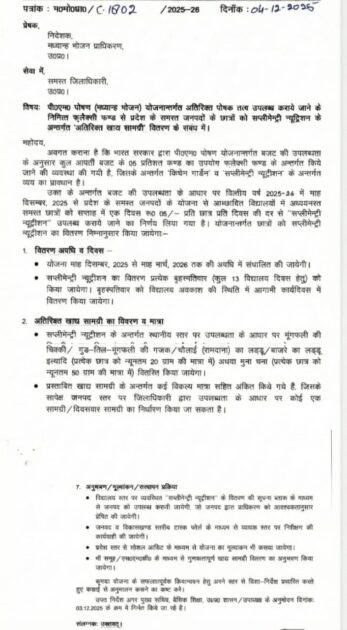 यह कदम बच्चों के स्वास्थ्य और पोषण को बेहतर बनाने के साथ-साथ उनकी शारीरिक एवं मानसिक विकास में योगदान देगा। योजना का कड़ाई से पालन सुनिश्चित करने के लिए सभी जिलाधिकारियों और विद्यालयों को विशेष निर्देश जारी किए गए हैं।