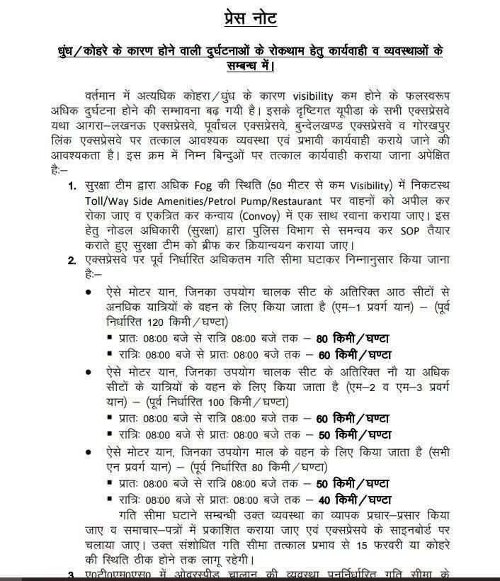 рдпреВрдкреАрдбрд╛ рджреНрд╡рд╛рд░рд╛ рдЬрд╛рд░реА рдирд┐рд░реНрджреЗрд╢реЛрдВ рдХреЗ рдЕрдиреБрд╕рд╛рд░, 19 рджрд┐рд╕рдВрдмрд░ рд╕реЗ 15 рдлрд░рд╡рд░реА рдпрд╛ рдХреЛрд╣рд░реЗ рдХреА рд╕реНрдерд┐рддрд┐ рд╕рд╛рдорд╛рдиреНрдп рд╣реЛрдиреЗ рддрдХ рд╕рдВрд╢реЛрдзрд┐рдд рд╕реНрдкреАрдб рд▓рд┐рдорд┐рдЯ рд▓рд╛рдЧреВ рд░рд╣реЗрдЧреАред рдЗрд╕ рджреМрд░рд╛рди рдпрдореБрдирд╛ рдПрдХреНрд╕рдкреНрд░реЗрд╕рд╡реЗ, рдЖрдЧрд░рд╛-рд▓рдЦрдирдК рдПрдХреНрд╕рдкреНрд░реЗрд╕рд╡реЗ, рдкреВрд░реНрд╡рд╛рдВрдЪрд▓ рдПрдХреНрд╕рдкреНрд░реЗрд╕рд╡реЗ, рдмреБрдВрджреЗрд▓рдЦрдВрдб рдПрдХреНрд╕рдкреНрд░реЗрд╕рд╡реЗ рдФрд░ рдЧреЛрд░рдЦрдкреБрд░ рд▓рд┐рдВрдХ рдПрдХреНрд╕рдкреНрд░реЗрд╕рд╡реЗ рдкрд░ рд╡рд┐рд╢реЗрд╖ рд╕рддрд░реНрдХрддрд╛ рдмрд░рддреА рдЬрд╛рдПрдЧреАред