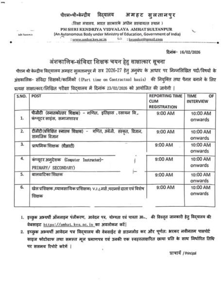 केंद्रीय विद्यालय में होगा इंटरव्यू