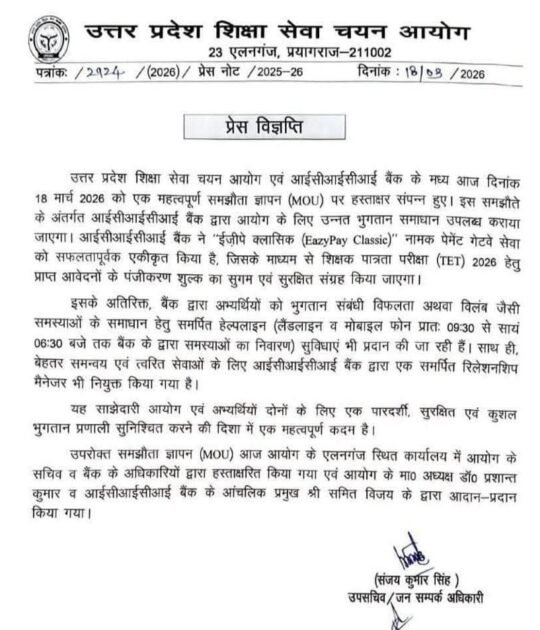 Home2026MarchUP TET 2026 महत्वपूर्ण सूचना✍️* UP TET 2026 महत्वपूर्ण सूचना✍️*By Feature Writer / March 18, 2026 WhatsApp Channel Join Now WhatsApp Group Join Now Telegram Channel Join Now आयोग ने ICICI Bank के साथ MOU साइन किया है अब UP TET 2026 आवेदन शुल्क EazyPay Classic के माध्यम से जमा होगा☝️