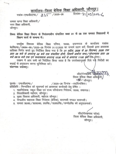 उपर्युक्त विषयक बेसिक शिक्षा परिषद, उ०प्र०, प्रयागराज के कार्यालय पत्रांकः बे०शि०प०/ 19684-89/2025-26 दिनांक 31.12.2025 का सन्दर्भ ग्रहण करें, जिसके द्वारा अवकाश तालिका निर्गत करते हुए निर्देशित किया गया है कि 01 अप्रैल, 2026 से 30 सितम्बर, 2026 तक प्रातः 08 बजे से अपरान्ह 02 बजे तक संचालित होगी, जिसमें प्रार्थना सभा/ योगाभ्यास प्रातः 08 बजे 08:15 बजे तक एवं मध्यावकाश अपरान्ह 10:30 बजे से अपरान्ह 11:00 बजे तक होगा।